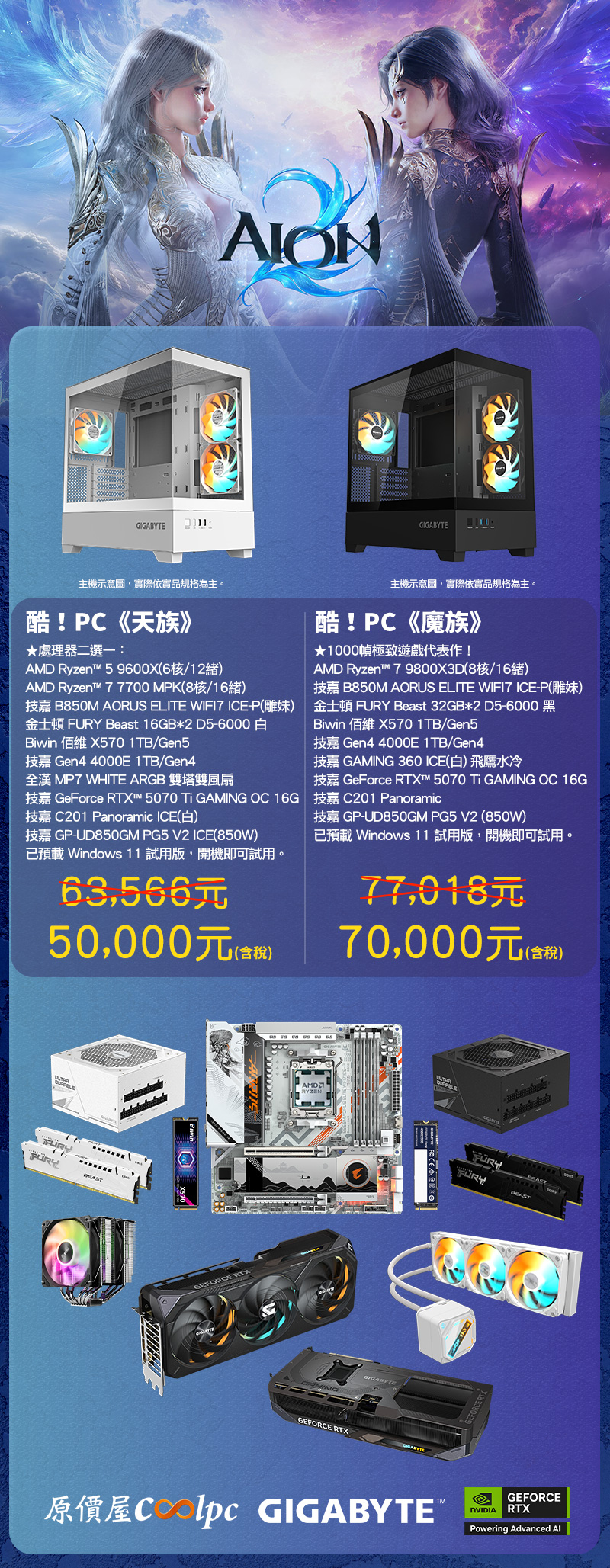 酷!PC《天族》《魔族》兩款主架構全搭技嘉系列,從技嘉 B850M AORUS ELITE WIFI7 ICE-P 雕妹主機板開頭:二次元的突破性設計理念,搭配 12+2+2 相供電、VRM Thermal Armor 散熱 + PCIe 5.0 資源,穩如泰山、快如閃電!技嘉 GeForce RTX™ 5070 Ti GAMING OC 16G 顯示卡:神一般的 DLSS 4 AI 超解析度,配上出色的風之力散熱系統,結合伺服器級導熱凝膠、Hawk 風扇、複合式銅質導熱管 + 大面積導熱板,不論 AI 運算或遊戲表現皆不容小覷!技嘉 GP-UD850GM PG5 V2 850W 電源:全模組 ATX3.1 穩定輸出 + 10 年保固長長久久!技嘉 C201 Panoramic 機殼:內建 ARGB 三風扇 + 270°全景玻璃,主打的就是一個散熱快,視野又好!硬碟選用美國 TIME 雜誌評選肯定的佰維 1TB Gen5 SSD,再加一顆技嘉 1TB Gen4 SSD 輔助,輕鬆配置遊戲空間。Gen5 高效能強調 14000Mbps 讀取,隨便都是 Gen 4 兩倍以上的讀取速度,延遲更低,過圖更快,反映就是快人一步唯快不破!而酷!PC《天族》全機為白色主視覺,主打 AMD CPU 二選一(R5 9600X 或 R7 7700 MPK),金士頓 FURY Beast 16GBx2 D5-6000(白) 記憶體、全漢 MP7 WHITE ARGB 散熱器(6 導管 + FDB 雙風扇抑制溫度);酷!PC《魔族》為黑色主視覺,直接使用遊戲霸主 AMD R7 9800X3D – 頂!金士頓 FURY Beast 32GBx2 D5-6000(黑) – 頂!技嘉 GAMING 360 ICE 水冷散熱器 – 頂!