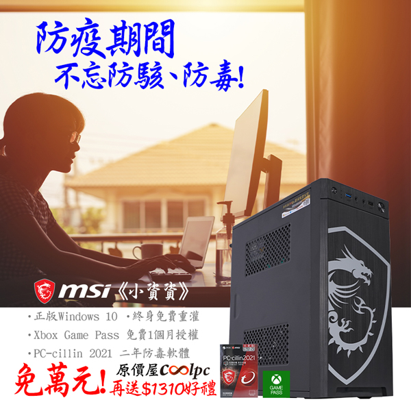 09/01開學日即將到來,加上全國二級警戒延長至09/06,防疫期間還是會有居家辦公、遠距學習的需求,在家上網也要兼顧資料防毒、防駭安全措施,讓你的電腦多一分保障!現在來原價屋購買《小資資》套裝電腦,不僅內含Windows 10 最新系統和驅動程式,帶回家過電開機即可使用,而且還享有原價屋終身免費重灌作業系統服務,省去自己組裝、安裝系統等等零碎時間!還要加碼再送PC-cillin 2021 防毒軟體(二年)玩家版(價值$990元),規格採用Intel G6400 2核/4緒處理器、B460系列晶片主機板、8G DDR4記憶體、256GB PCIe M.2固態硬碟以及MSI龍魂機殼含350瓦電源,滿足文書、居家辦公、遠距教學、4K影音,甚至玩個英雄聯盟也行!除此之外內含系統版本還能免費綁定 Xbox Game Pass 1個月授權!(市價$320元),另外也有無OS版本機種可以選擇,歡迎有興趣的朋友可以利用網路下單,或到門市做詢問,或利用原價屋蝦皮商城購買啦!
