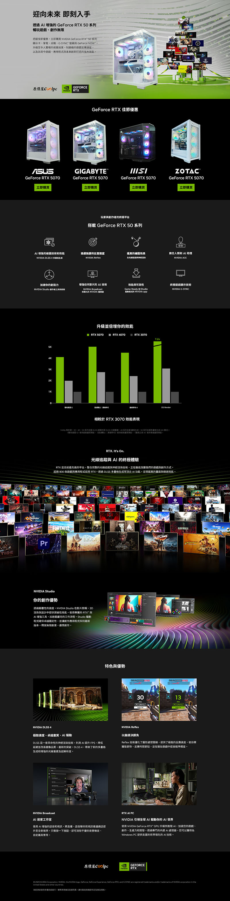 NVIDIA GeForce RTX 50 系列顯示卡提供遊戲領域的 NVIDIA DLSS AI 技術,搭載 GeForce RTX 50 系列產品的玩家可以透過 DLSS 4 的「超高解析度」與「多畫格生成」技術,將 FPS 提升最高可達 8 倍,在包括 《AION2》、《戰地風雲 6》、《燕雲十六聲》、《NBA 2K26》、《浩劫殺陣2:車諾比之心》、《闇龍紀元:紗障守護者》、《印第安納瓊斯:古老之圈》、《宣誓》、《光與影:33 號遠征隊》、《明末:淵虛之羽》、《黑神話:悟空》、《電馭叛客 2077》、《心靈殺手 2》等超過 100 款遊戲中,都能呈現頂級畫質、流暢的 FPS 表現與逼真的光影效果!光線重建技術在《心靈殺手 2》遊戲大作下尤其出色,全光線追蹤技術為幽暗場景賦予逼真細膩的光影與反射效果,卓越的深度及真實感,為玩家帶來更加身臨其境的沉浸體驗。此外,NVIDIA Reflex 技術透過最佳化顯示卡與 CPU 的渲染同步,大幅降低系統延遲,提升競技遊戲的反應速度,讓玩家在《戰地風雲 6》、《特戰英豪》、《Apex 英雄》等遊戲中獲得更快的目標鎖定與精準瞄準。轉戰到創作者應用,NVIDIA Studio 結合 RTX GPU 效能與 AI 加速技術,影片編輯更快、3D 渲染更流暢,直播也順暢無礙,沒有限制、沒有延遲,您完全可盡情揮灑創意。還有 NVIDIA Studio 專屬驅動程式,加速創作應用程式表現。Adobe Premiere Pro 可透過GeForce GPU, 強化影音編輯流程,加速影片轉場,特效隨選即用。NVIDIA Studio 讓創作者應用程式速度猶如風馳電掣,讓您創作和工作的速度更勝以往。而目前最熱門的開源文本生圖應用當屬 Stable Diffusion 模型,透過 ComfyUI 介面簡易輸入提示詞後立即生成影像,若要短時間內生成大量影像進行篩選,第五代 Tensor 核心的 NVIDIA GeForce RTX 50 系列產品是 AI 工作者的首選。AI 應用還有針對會議視訊最佳化的 NVIDIA Broadcast 應用程式:可將任何空間變成居家工作室,能運用 AI 一鍵消除背景雜音與空間回音、虛擬背景(替換、刪除、模糊)、視訊雜訊消除、自動取景、眼神接觸,不論鏡頭中的您如何移動或眼神飄移,AI 皆能即刻動態追蹤,讓您始終保持鏡頭中的 C 位,讓這場視訊會議和直播畫面更加專業與自然。透過 NVIDIA App,您可以輕鬆管理 GeForce RTX 50 系列的驅動程式更新,無論是即時監控 GPU 狀態、調整圖形選項,或透過 DLSS Override 來升級舊遊戲的 AI 模型,一站式提升效能與體驗。特別值得一提的是全新驅動層級的 AI 模型:Smooth Motion,這項創新為《原神》、《沉默之丘》等遊戲帶來額外畫格推論,讓鎖幀更流暢,沉浸感大幅提升。