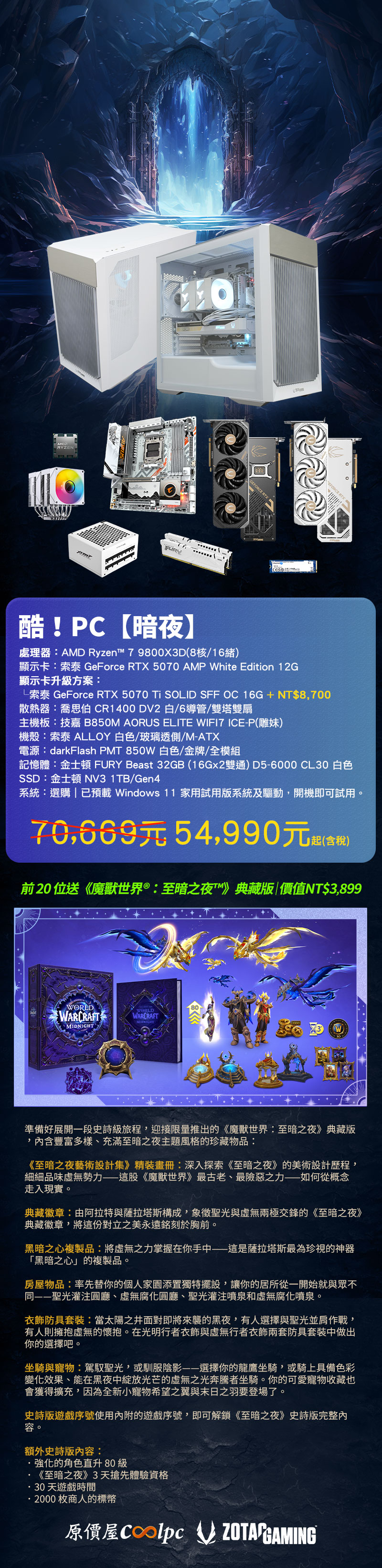 勇士們,我們回家了!闊別多年,太陽之井的聖光與虛無的決戰終於在奎爾薩拉斯拉開序幕!看著熟悉的永歌森林與祖阿曼在《魔獸世界:至暗之夜™》中獲得重新構思與重建,那種悸動難以言喻。為了慶祝這史詩級的一刻,原價屋推出酷!PC【暗夜】主機,我們深知,唯有地表最強遊戲處理器 9800X3D 與 RTX 50 系列顯卡,才能在對抗薩拉塔斯的戰場上,提供無懈可擊的流暢體驗。這波不只是 cover 零組件價格,前 20 位購買者,更要送您整套價值 NT$3,899《魔獸世界®:至暗之夜™》實體典藏版!對於收藏控來說,這不只是主機,更是您守護艾澤拉斯最尊榮的收藏證明!手腳慢了就只能看著別人開箱!