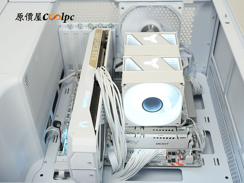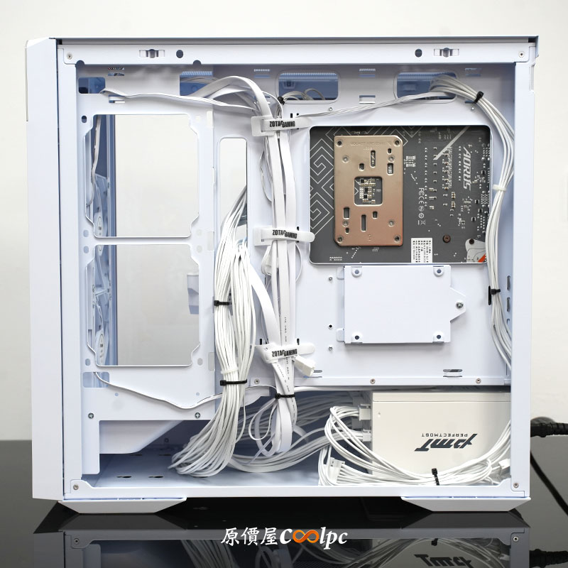 * 索泰 ALLOY 白色機殼 + darkFlash PMT 850W 白色電源:機殼面板採用白色柵欄設計,搭配上方銀色絲紋飾板,不僅美觀更兼顧大面積進氣,內層配備可快拆清洗的防塵濾網,確保內部組件遠離灰塵侵擾。側邊搭載全景玻璃透側,將內部潔白俐落的硬體如藝術品般完整展現。電源通過 80 PLUS 金牌認證,穩定輸出有保障!支援全新 ATX3.1 及 PCIe 5.1 規格。全模組化設計讓內部整潔有序的同時,也能降低散熱受阻並提升排熱效率。